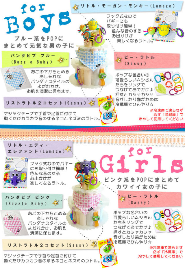 | セット内容 | おむつ38〜43枚(写真はおむつMサイズを上段:5枚、中段:12枚、下段23枚使用) 男の子用:リトル・モーガン・モンキー(Lamaze)、バンダビブ ブルー(Bazzle Baby)、スウィング・モンキーラトル(Sassy)(※只今ムシさんのラトルでお届けいたします)、リストラトル2コセット(Sassy) 女の子用:リトル・エディ・エレファント(Lamaze)、バンダビブ ピンク(Bazzle Baby)、スウィング・モンキーラトル(Sassy)(※只今ムシさんのラトルでお届けいたします)、リストラトル2コセット(Sassy) |