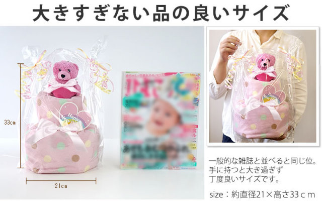 | セット内容 | おむつ17枚 (写真はおむつを上段:6枚、下段:11枚使用) ブランケット:70×100cm、ポリエステル100% くまストラップ:約15.5×10.5cm |
