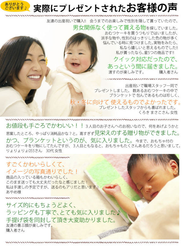 急ぎの注文に迅速な対応ありがとうございました。持参用の手提げ袋も付けていただき助かりました。進物用のためブランケット等の使用感はわかりませんが、オムツもたくさん入っていて喜ばれたと思います。ただ、クマさんの人形が写真ほどに可愛くなかったのが残念でした。