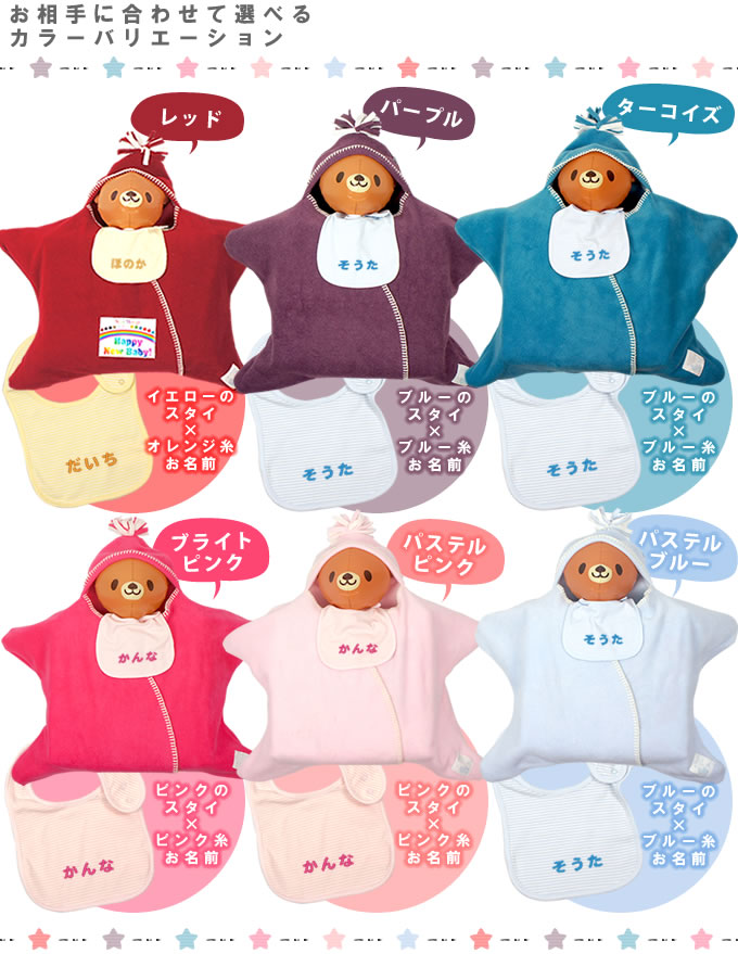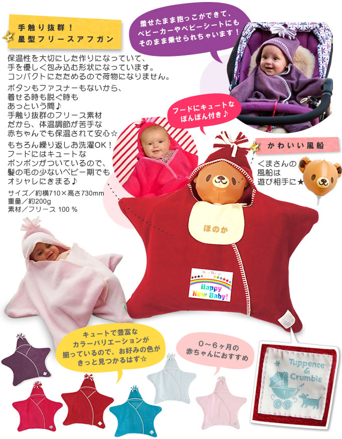 | セット内容 | □おむつ 新生児用の場合90枚、Sサイズの場合80枚 (メーカーの製造によって増える場合もあります。) □星型フリースアフガン×1 生産地:イギリス 素材・成分:フリース(ポリエチレンテレフタラート) 100 % □スタイ×1 □くまのバルーン×1 |