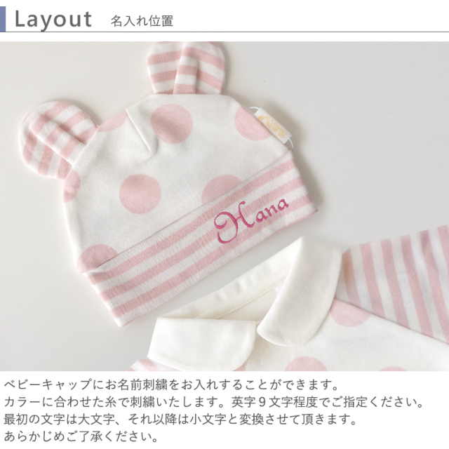 ベビーキャップに赤ちゃんのお名前を刺繍することができます。