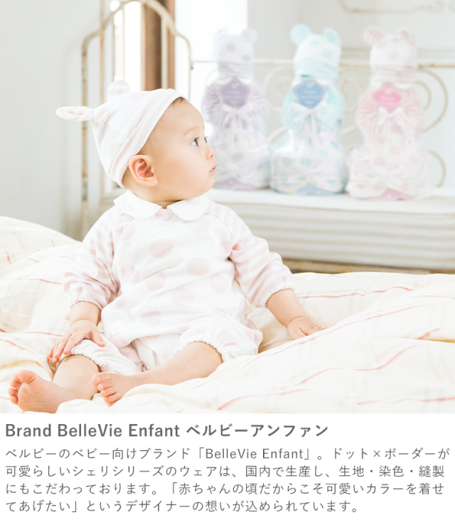 ベルビーのベビー向けブランド「BelleVie Enfant」。ドット×ボーダーが可愛らしいシェリシリーズのウェアは、国内で生産し、
