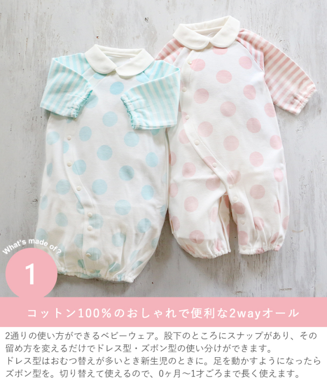 ドレス型はおむつ替えが多いとき新生児のときに。足を動かすようになったらズボン型を。