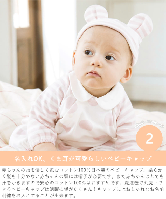 赤ちゃんの頭を優しく包むコットン100%日本製のベビーキャップ。