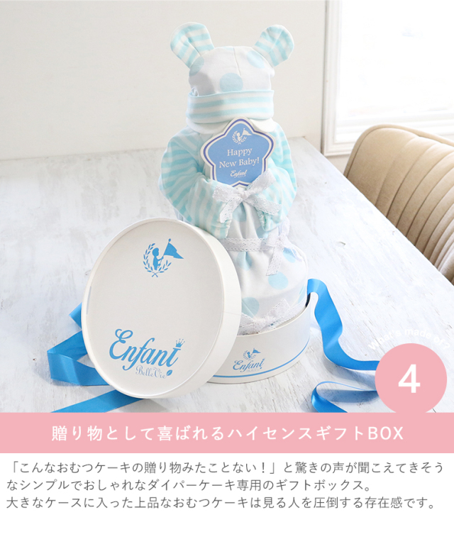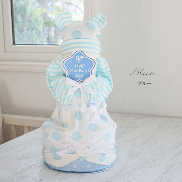 ベルビーアンファンオリジナルのベビーウェア・キャップ・おむつで作り上げた他にはない印象的なおむつケーキ。