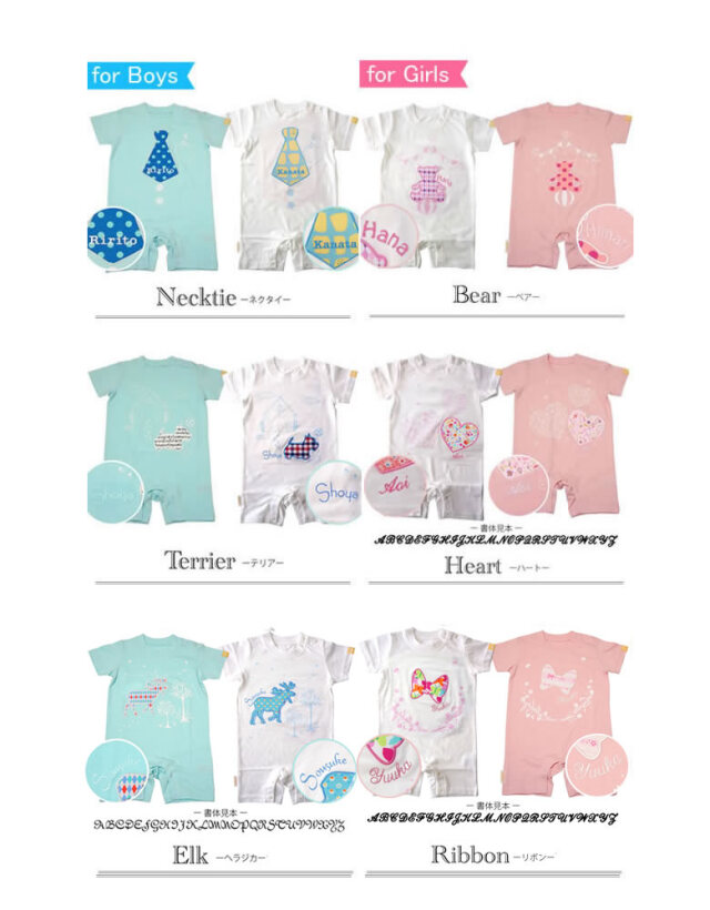 | 6種類のデザインからお選びください。それぞれお名前をお入れしてお届けします。可愛らしいアップリケを引き立てるキュートなイラストとデザインの一部のようなお名前刺繍はお子さんもママもきっと喜んでくれるはず!お名前の書体はお任せください。 |