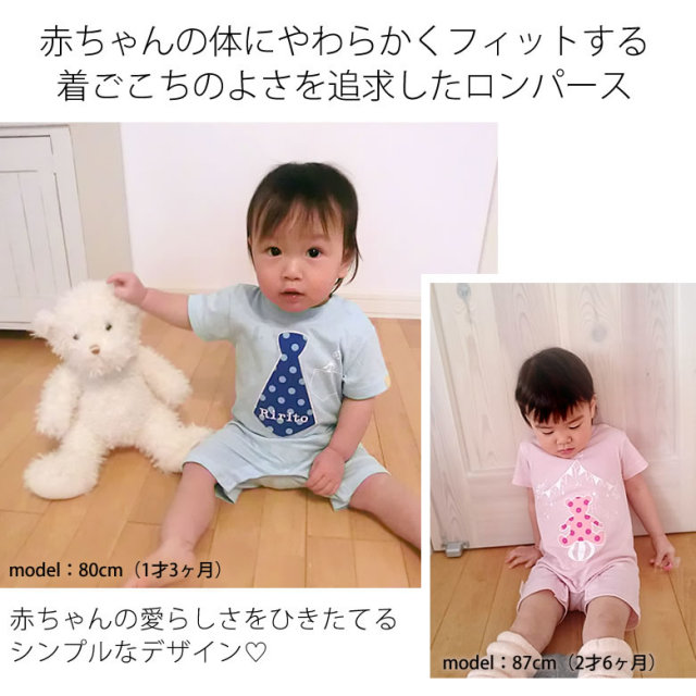 ※ホワイトロンパースのタイは、ネクタイ型のアップリケを取る位置によって柄が異なります。予めご了承ください。