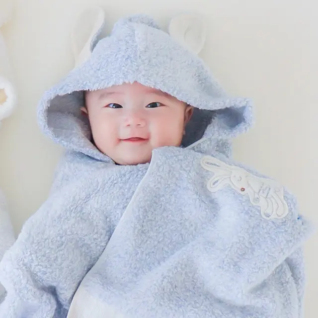 ぴょこんと可愛らしいうさ耳のついたフードを被ればパパもママも虜になっちゃう大人気のフード付きバスタオル。