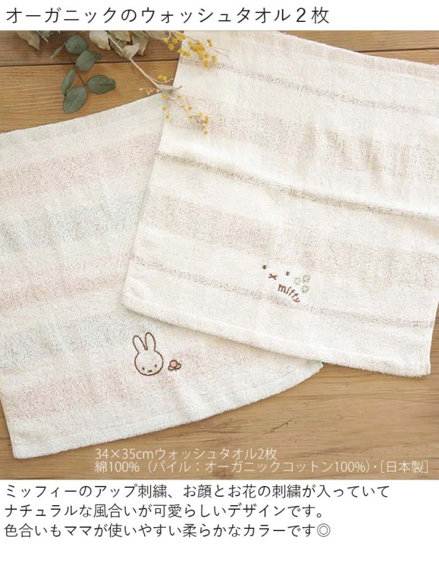 赤ちゃんのお肌にも安心してお使い頂ける日本製のオーガニックコットンタオル。2枚のウォッシュタオルはミッフィーのアップ刺繍、お顔とお花の刺繍が入っていて