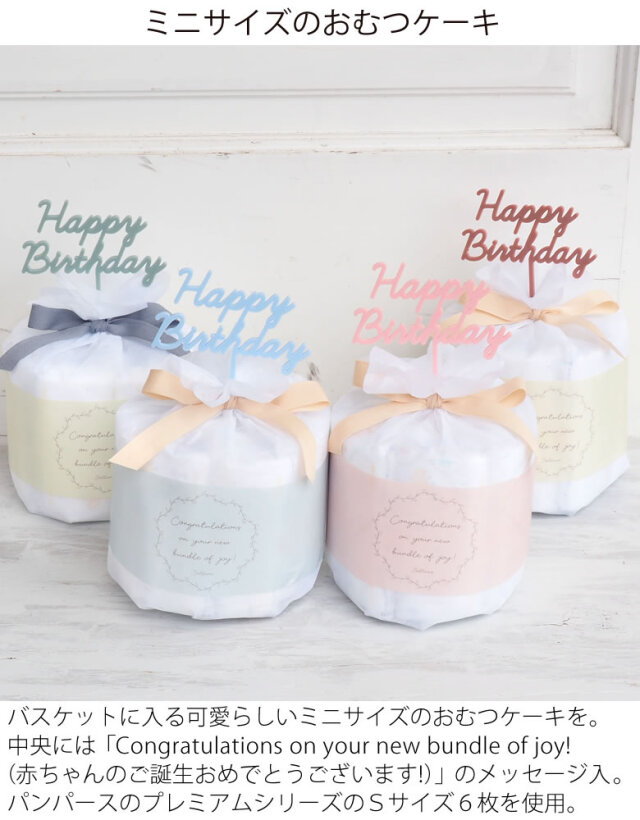 バスケットに入る可愛らしいミニサイズのおむつケーキを。