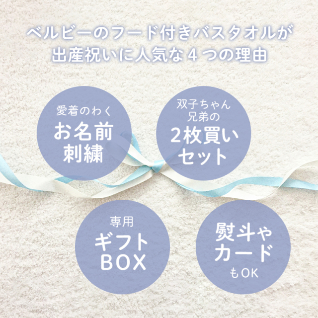 バスタオルにはタオルカラーに馴染む糸でお名前刺繍が入り、愛着のわく一枚に。