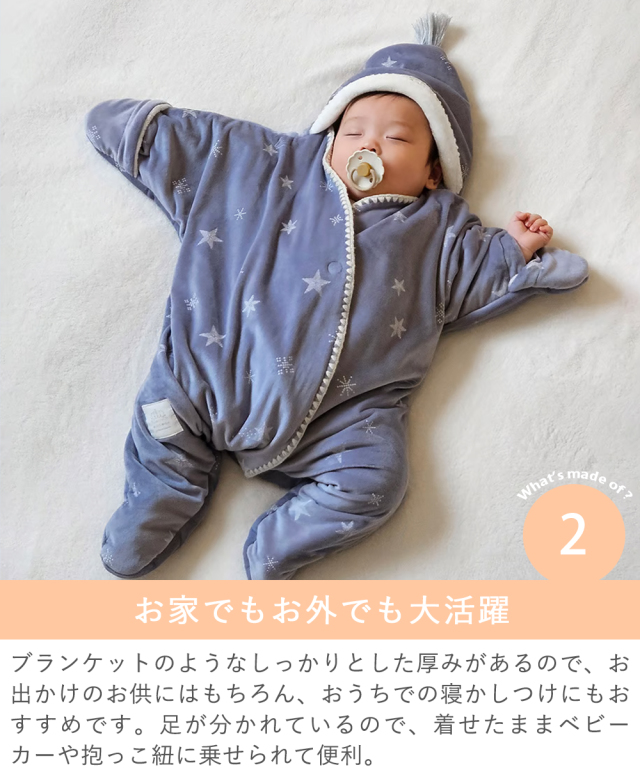 足が分かれているので、着せたままベビーカーや抱っこ紐に乗せられて便利。