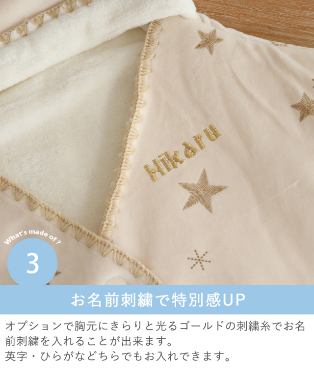 オプションで胸元にきらりと光るゴールドの刺繍糸でお名前刺繍を入れることが出来ます。