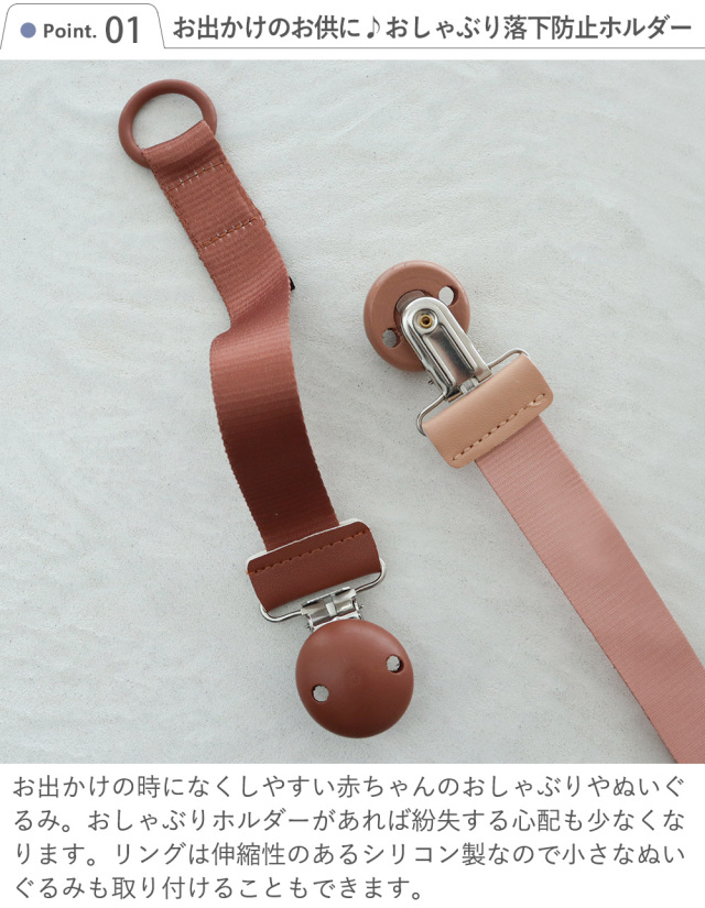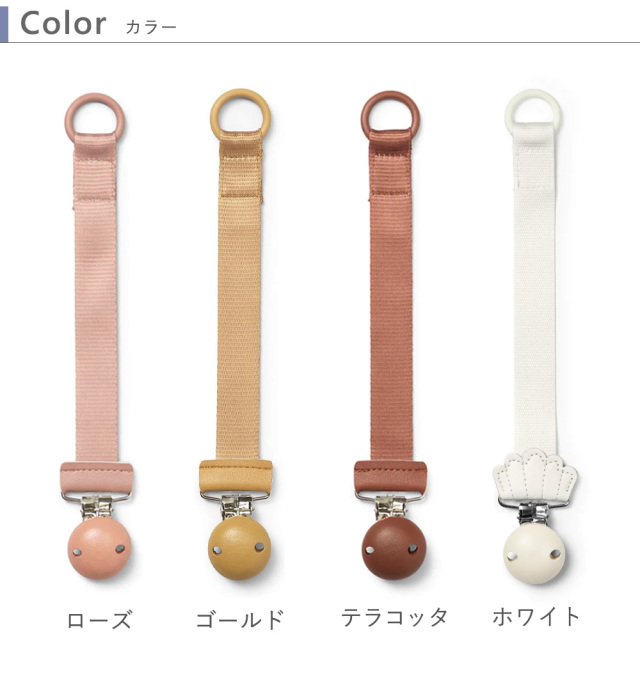 どんなおしゃぶりにも対応しており、豊富なカラーバリエーションから選べます。