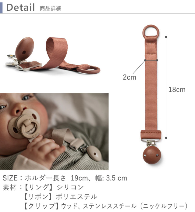 北欧スウェーデン王室御用達の「Elodie(エロディ)」の機能性、安全性にこだわったおしゃぶりクリップ。シンプルなデザインとニュアンスカラーがおしゃれ。