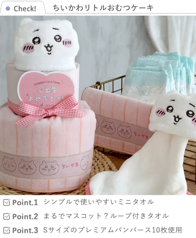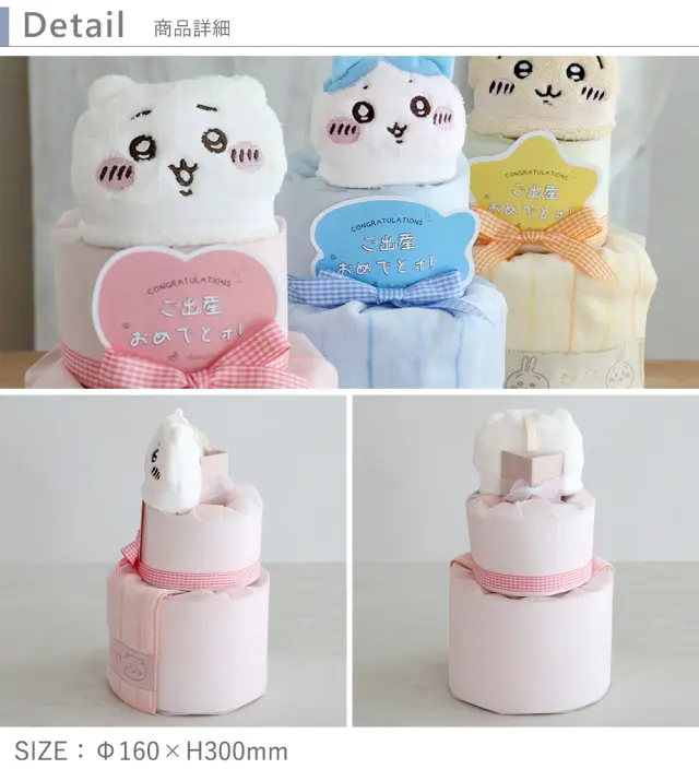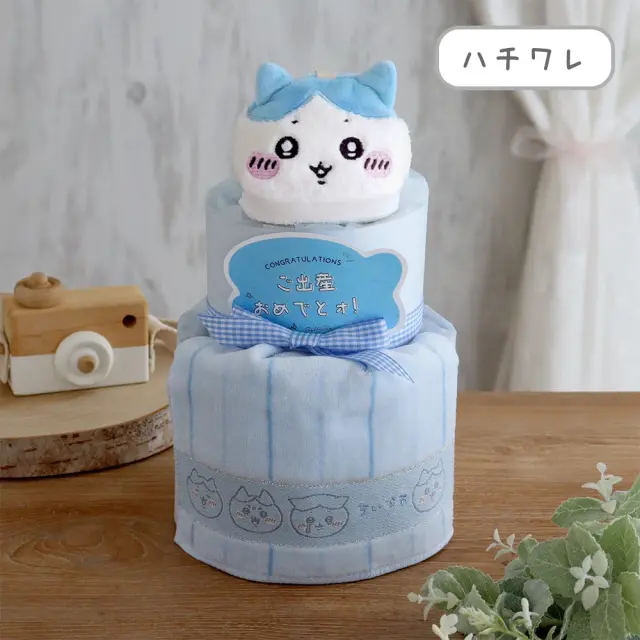 2段の小さめサイズのおむつケーキは、ちいかわ・ハチワレ・うさぎの3種類をご用意しました。