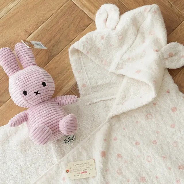 オーガニックコットン100%のフード付きもこもこバスタオルと、