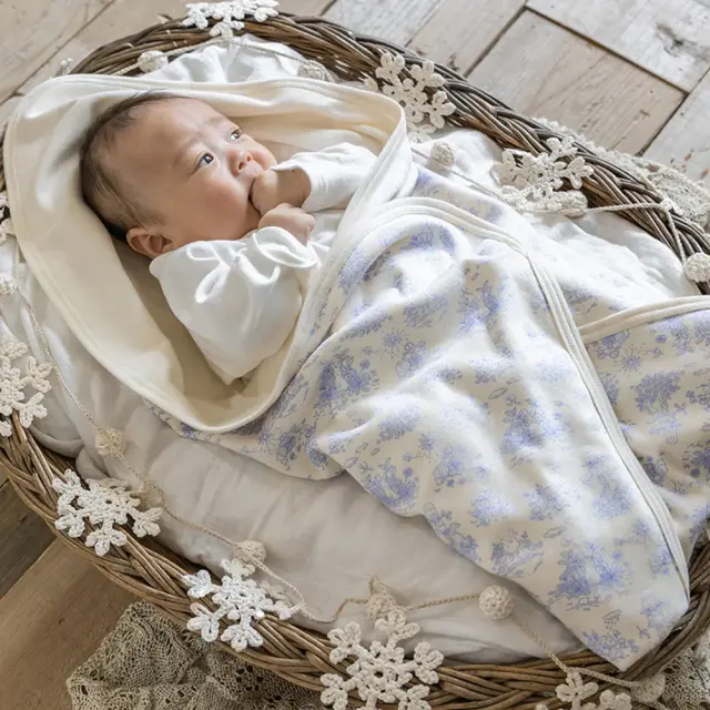 持ち運びにもちょうど良く、外出先でも赤やんを優しく包み込みます。お昼寝の肌がけにも。
