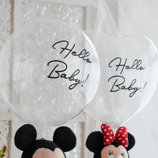 羽入りのクリアバルーンには「Hello Baby!」のメッセージ入り。