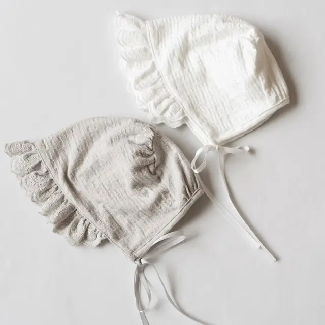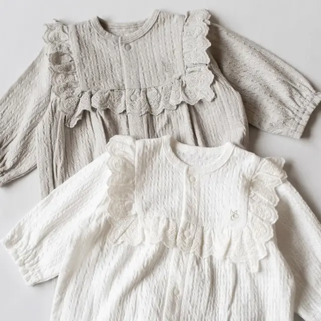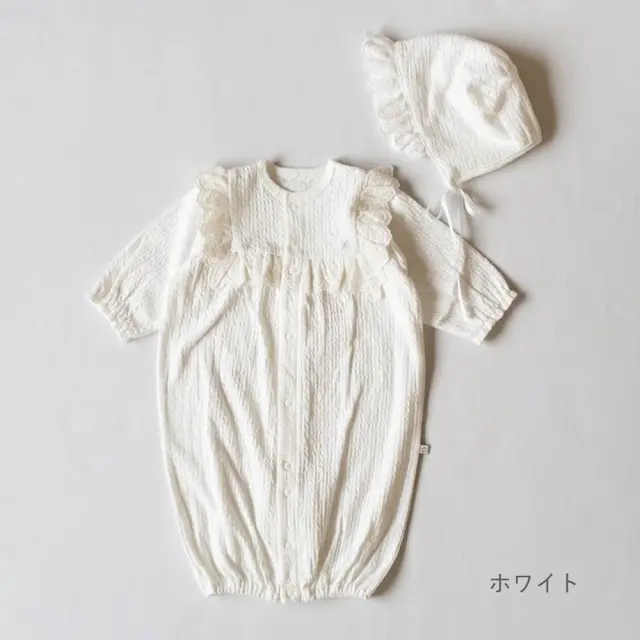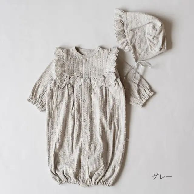 胸元のコットンレースが印象的な、2wayオール+ボンネットのセット。