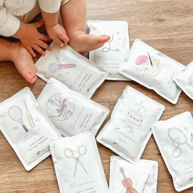 追加オプション(880円)で全ての袋の裏面にお名前と、ご希望の場合は生年月日をプリント致します。