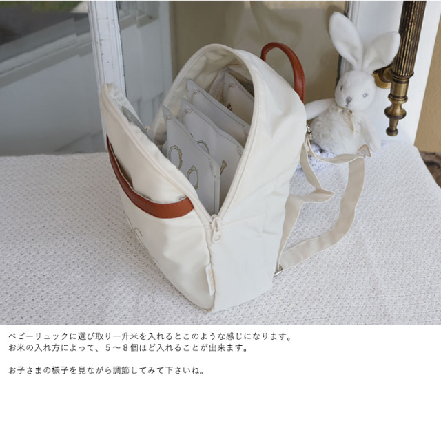 ベビーリュックに一升米で選び取りを入れるとこのような感じになります。
