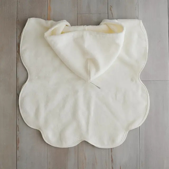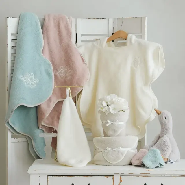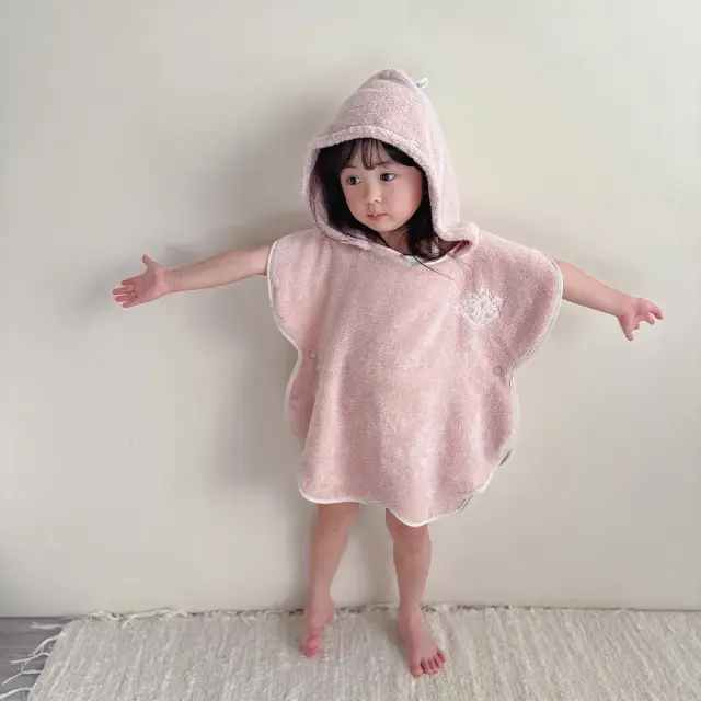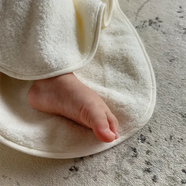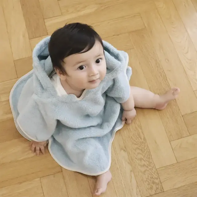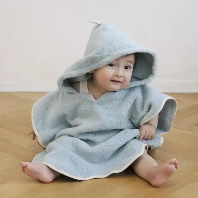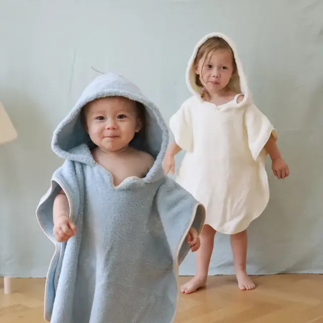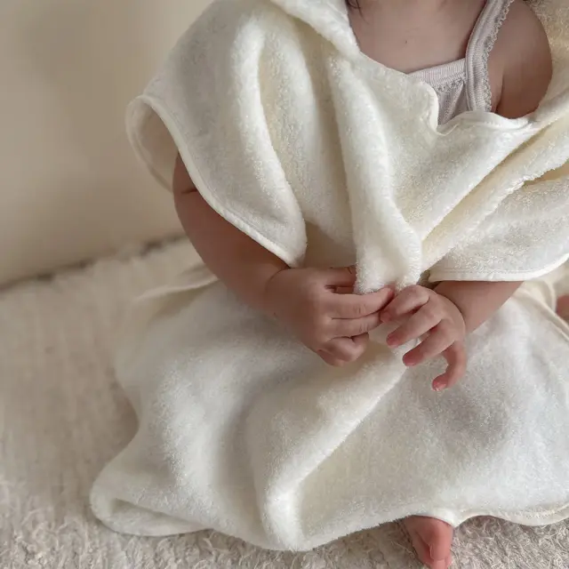 赤ちゃんをやさしく包み込む、オーガニックコットン100%の 両面パイルのフード付きバスポンチョ。