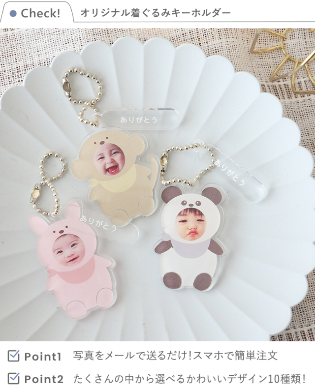 愛嬌満点の顔写真入りキーホルダーも添えられて、思わずほっこりするギフトです。