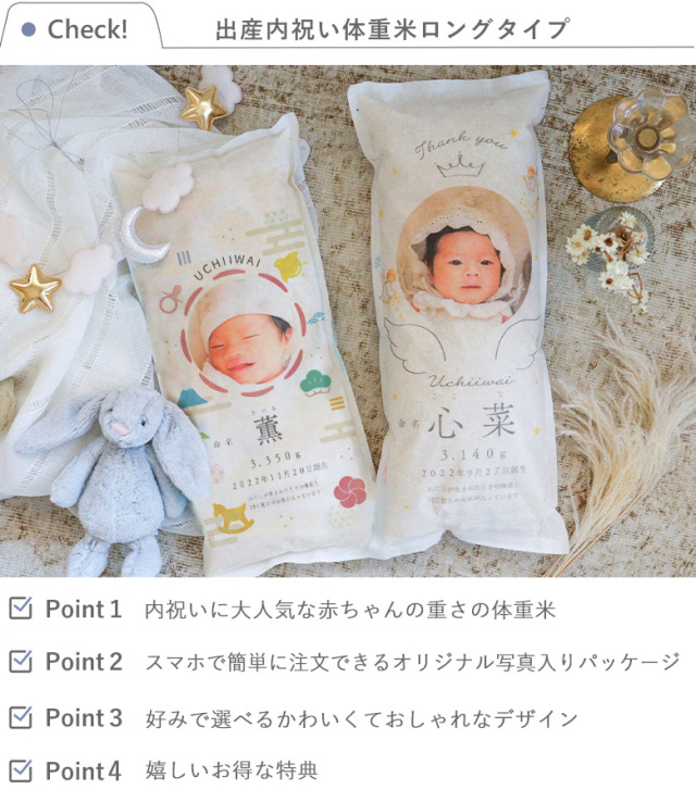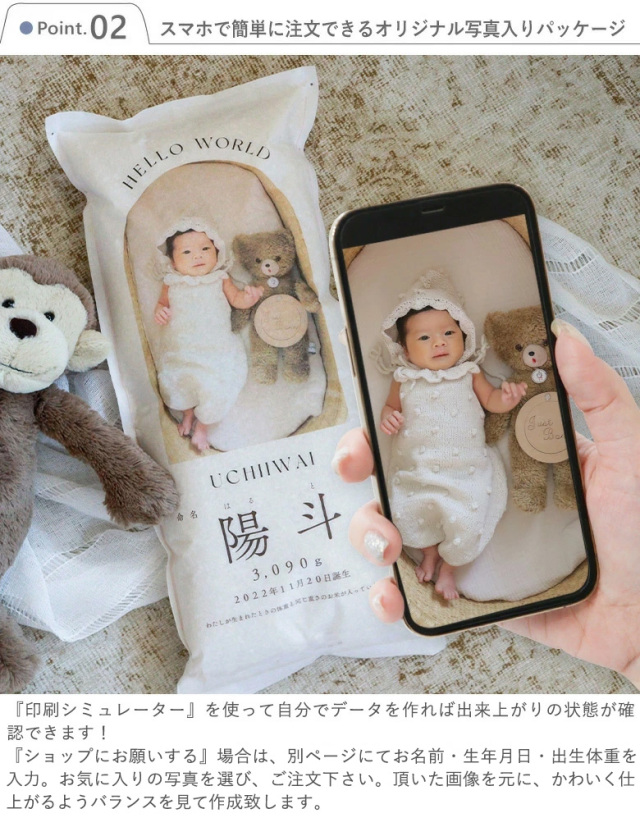 出産内祝いに人気!産まれた時の重さのお米が入った写真入り体重米。スマホで撮ったお気に入りのお写真で簡単にご注文♪