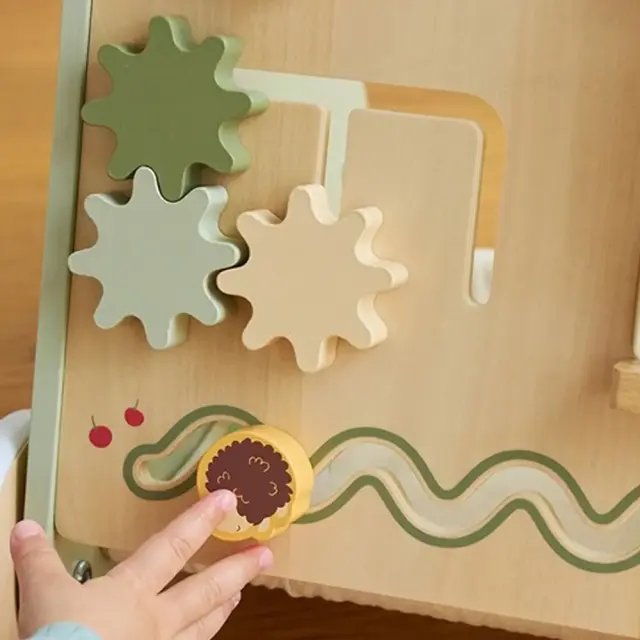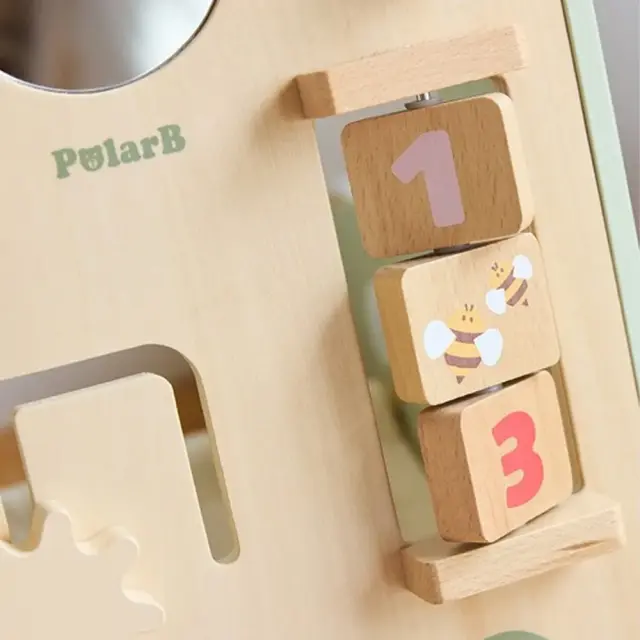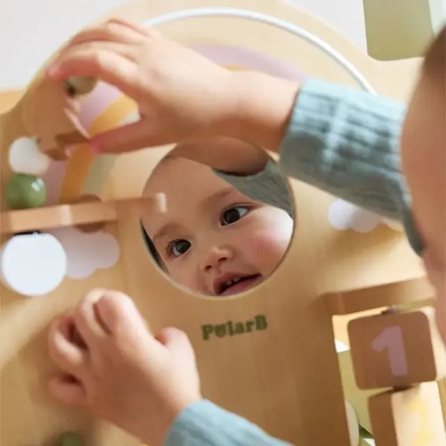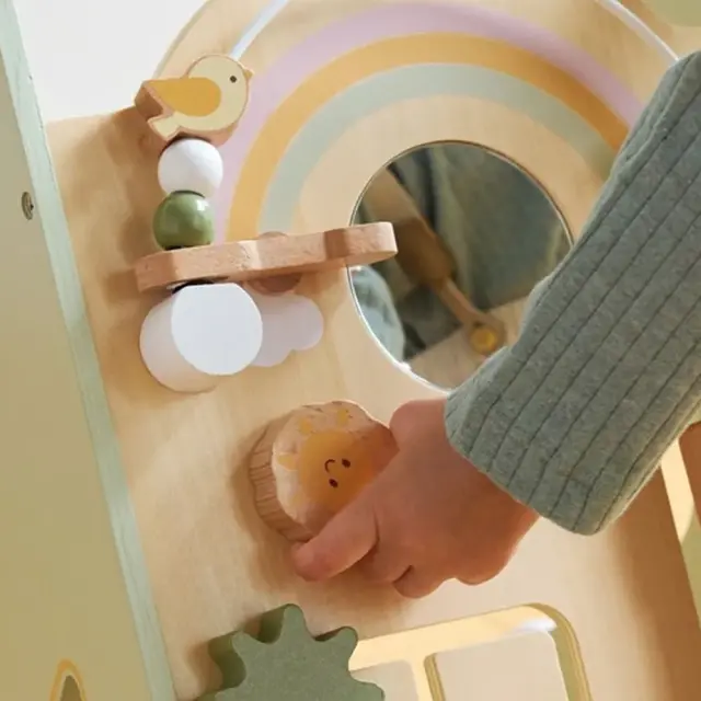 赤ちゃんが夢中になる、絵合わせや型はめ、ビーズ、ミラーなど、8つの仕掛け・遊び付き。