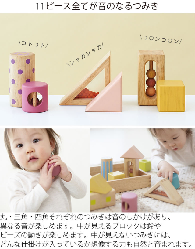 丸・三角・四角それぞれのつみきは音のしかけがあり、
