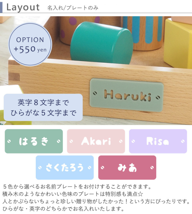 オプションで5色から選べるお名前プレートをお付けすることができます。