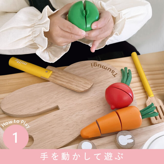 ごっこ遊びをしながら「ザクザク」「ジュージュー」などの擬音語や、「おいしい」「あまい」といった表現言葉の発達の手助けにも。