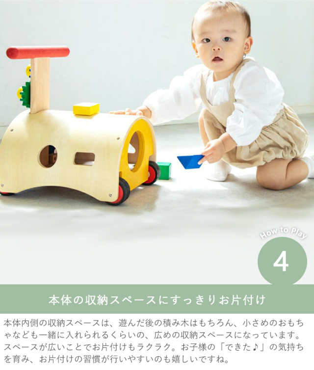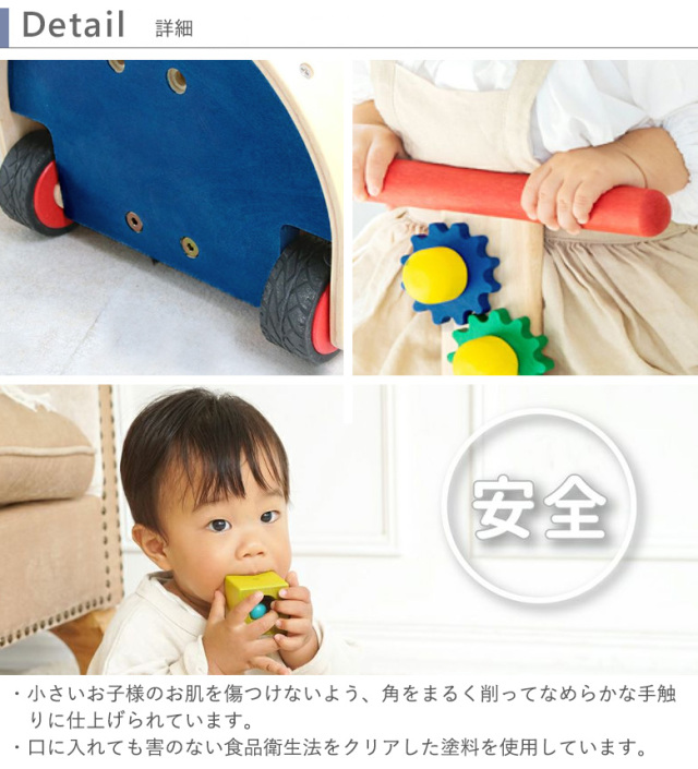 のっておして!すくすくウォーカーは、手押し車と足けり乗用玩具の2wayで楽しめる木製玩具です。また、型はめブロックやギアを回して遊ぶことができ、手先の器用さも養うことが出来ます。