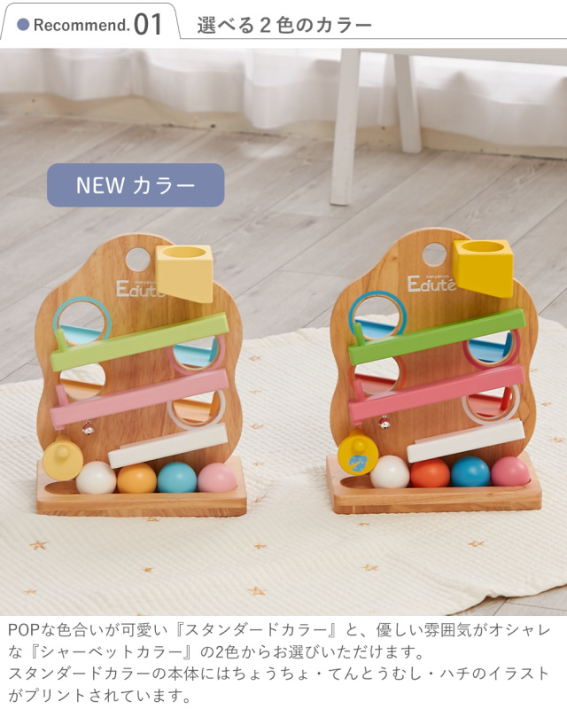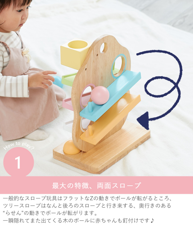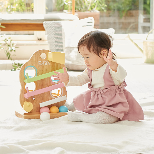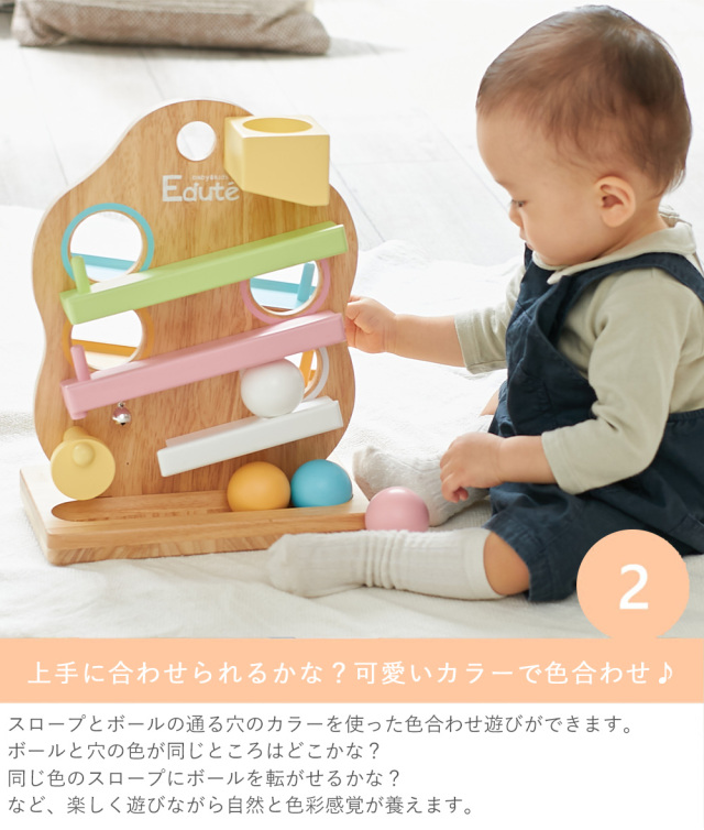 ボールとスロープで色合わせの知育遊びもでき、楽しく色彩感覚を養えます。