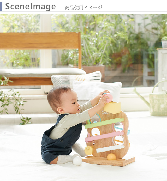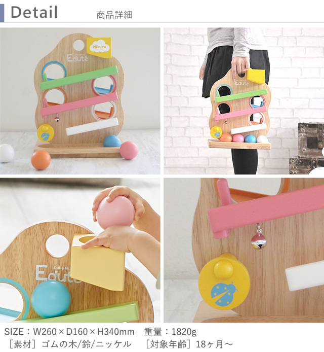 | ■セット内容:本体、ボール×4 ■SIZE: 箱サイズ:W270×D170×H380mm 商品サイズ:W260×D160×H340mm 重量:1820g ■素材:ゴムの木/鈴/ニッケル ■対象年齢: 18ヶ月〜 ■安全基準:安全基準STに合格した舐めても安全な塗料を使用しています。 また天然のゴムの木でできた環境にやさしい素材を使用しています。 |