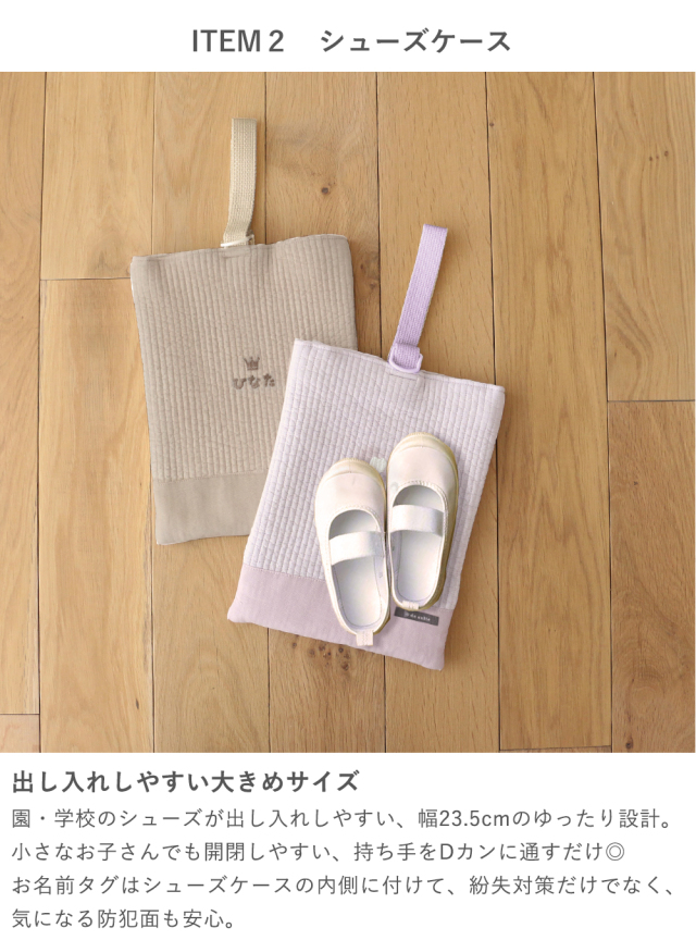 園・学校のシューズが出し入れしやすい、幅23.5cmのゆったり設計。 小さなお子さんでも開閉しやすい、持ち手をDカンに通すだけ◎ お名前タグはシューズケースの内側に付けて、紛失対策だけでなく、気になる防犯面も安心。