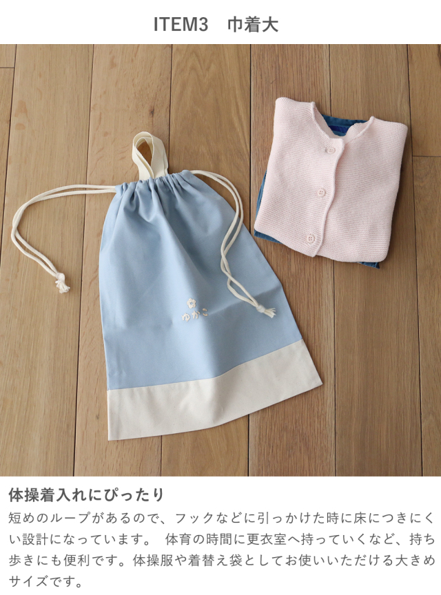 短めのループがあるので、フックなどに引っかけた時に床につきにくい設計になっています。 体育の時間に更衣室へ持っていくなど、持ち歩きにも便利です。体操服や着替え袋としてお使いいただける大きめサイズです。