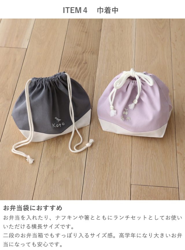 お弁当を入れたり、ナフキンや箸とともにランチセットとしてお使いいただける横長サイズです。 二段のお弁当箱でもすっぽり入るサイズ感。高学年になり大きいお弁当になっても安心です。