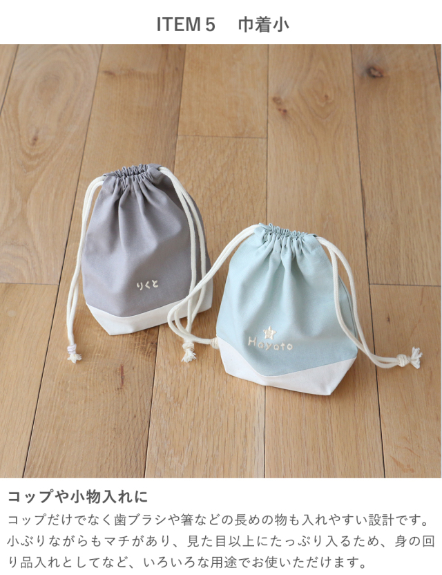 便利な引っ掛けループがついたレッスンバッグ、高学年でも使えるゆったり大きめなシューズケース、体操服入れなどに使用できる巾着L、お弁当にちょうどいい巾着M、コップや小物が入る巾着Sの5点がセットに!