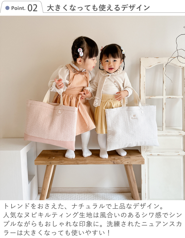 人気の「ヌビキルティング生地」と、洗練されたニュアンスカラーの「オックス生地」を使用。
