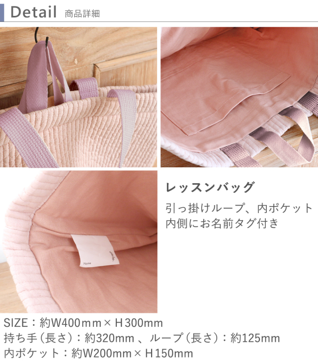 約幅40cm×高さ約30cmのレッスンバッグは、ピアノや英会話などの教材や、A4ファイルもすっぽり。通園から小学校の通学、習い事用のバッグとしても使いやすいサイズです。 持ち手以外にも短めのループを取り付け、引っかけた時に床につきにくい設計に。バッグの内側にはポケットつき。