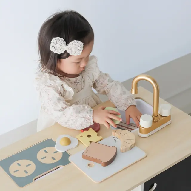 コンロやシンクでのおままごとから、背面の黒板を使ったお店屋さんごっこまで、遊びの幅がぐんと広がるリバーシブルキッチン。