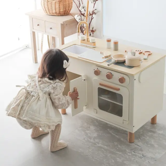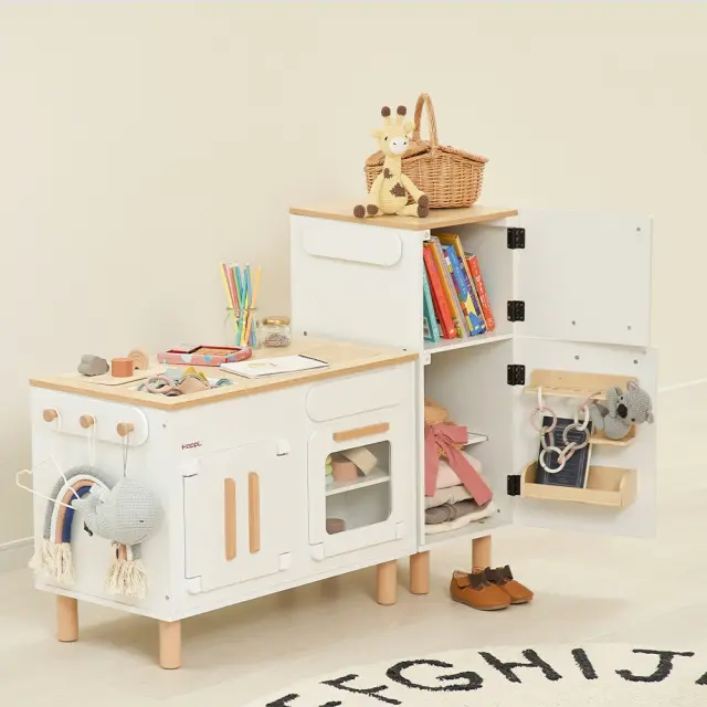 お子さまの成長に長く寄り添うおままごとキッチンは、A4サイズもすっぽり入る大きさ。