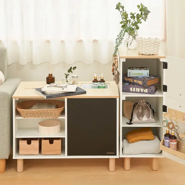 成長に合わせておもちゃから収納家具としても活躍し、お部屋に馴染む落ち着いたカラーがインテリアをおしゃれに演出します。