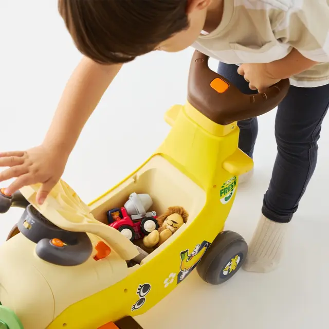 好奇心をくすぐる音や光の仕掛けがいっぱいで、乗って・押して・こいで・遊んでと、成長に合わせて長く楽しめます。