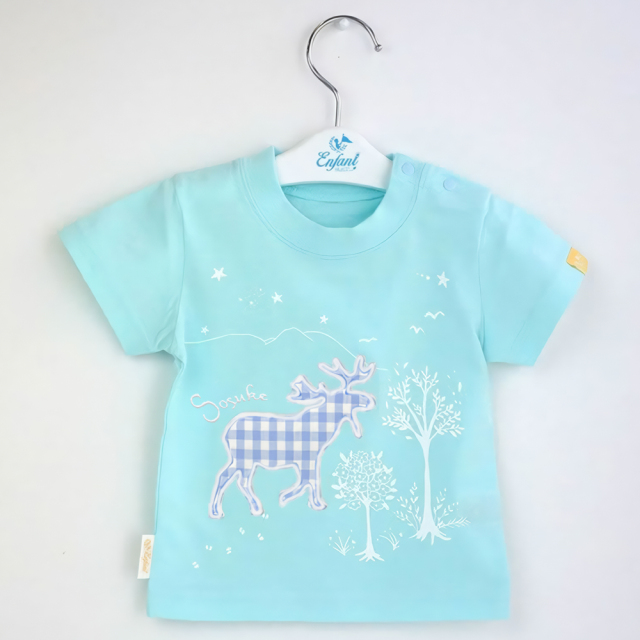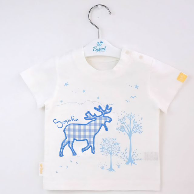 papa「わんちゃんがおさんぽしてるのかな?」 「優しい肌触りなのに洗っても型崩れしない」をコンセプトに、 ベビーの可愛さ引き立つ3種類のデザイン 「プリティパッチBlue Check」のデザインは - タイ - - テリア- - ヘラジカ - 商品の大きさに合わせたギフトバッグを同梱させていただきます