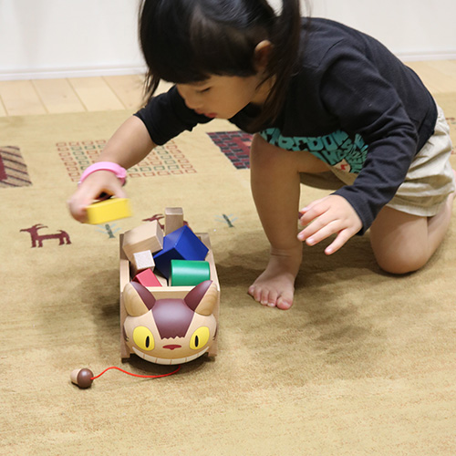 ネコバスには車輪が付いていてどんぐりの積み木のついた紐を引っ張ってコロコロ動かせます♪3歳97㎝の娘にはちょっと紐が短くて引っ張り難そうでしたが、2歳ぐらいがちょうど良いのかも。