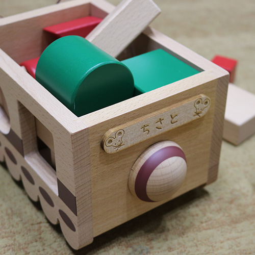 ネコバスのマルやシカクの窓からつみきを形に合わせて出し入れして遊べます。